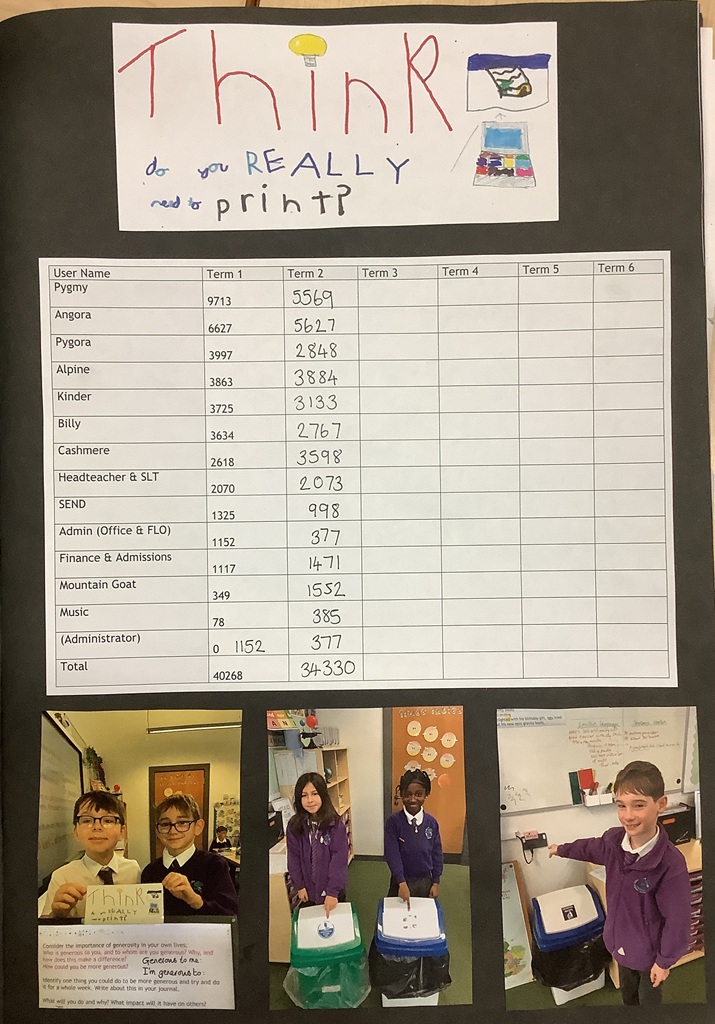 Our environmental project for Year 5 is exploring how to 'Reduce, Reuse, Recycle' and how we can action this at school. So far, we have worked on reducing the number of photocopies we make: not ony reducing energy costs but also the amount of paper we are using. We made some 'Think before you print' signs for everyone's computers. Each term, we let the classes know how they are doing. In the first term, we reduced it by 5,738 copies! We have also made signs for the bins around school to ensure the right things can be recycled. We have also made some signs to encourage the classes to switch off their smartboards at night as we noticed many were left on. Our metal recyclers have also been very busy collecting scrap metal and cans which we crush. We then take these to EMR recycling to raise money for our nature area. We are taking part in the Buutterfly Farmer project this year and will be creating our own butterfly garden - we can't wait to share the details with you! Take a look at some of the pages from our floor book.
