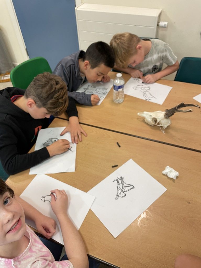 After our food, we learnt about hedgehogs and the dangers they are facing, both natural and human, then headed off on a hedgehog trail where we learnt more about them. Once we arrived in the glade, we started searching for survival boxes but got interrupted by some thunder so we made our way back to base to finish learning about ways we can survive in the wild. We then spent some time investigating skulls which was very interesting, and even did some great observational drawings.