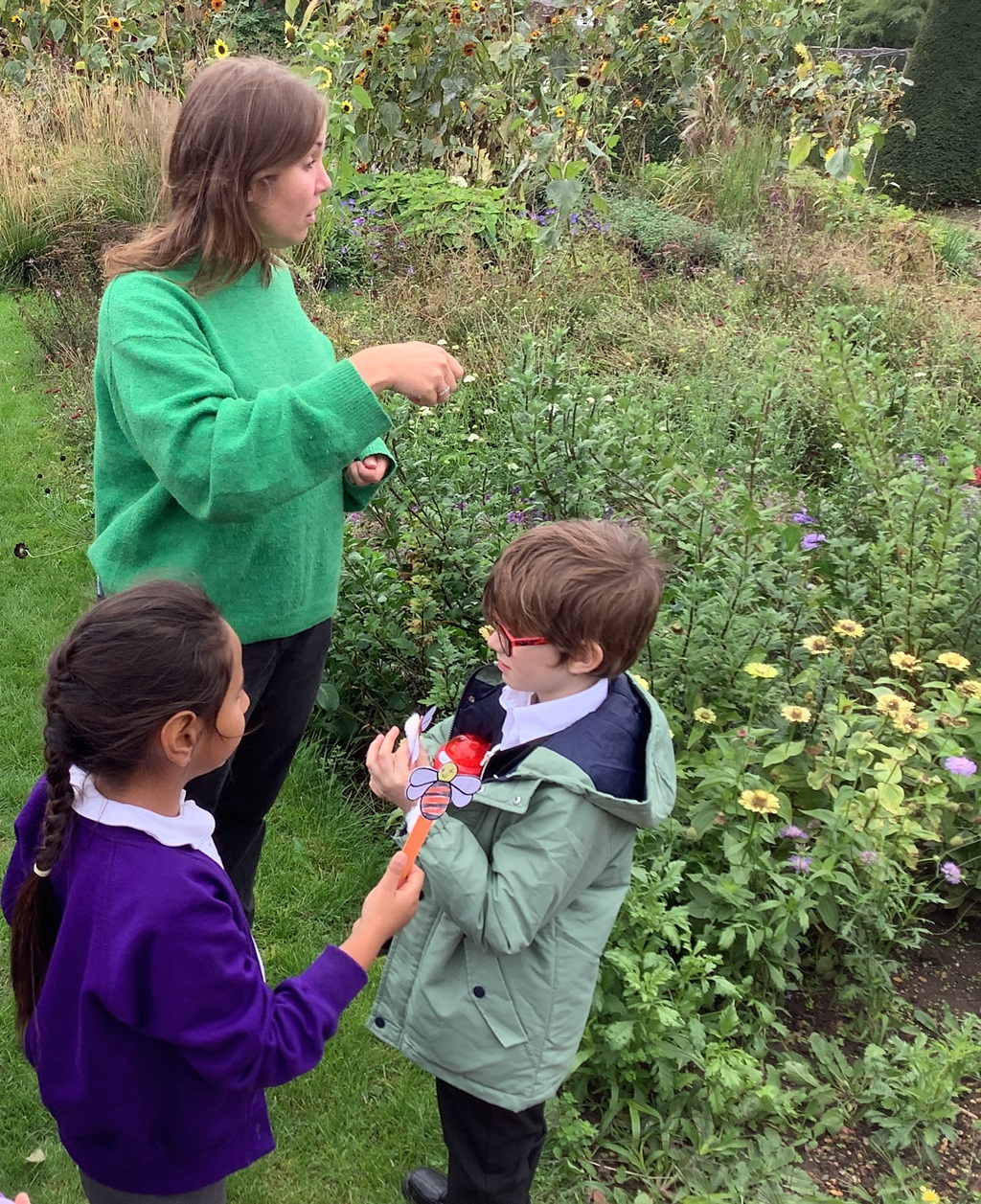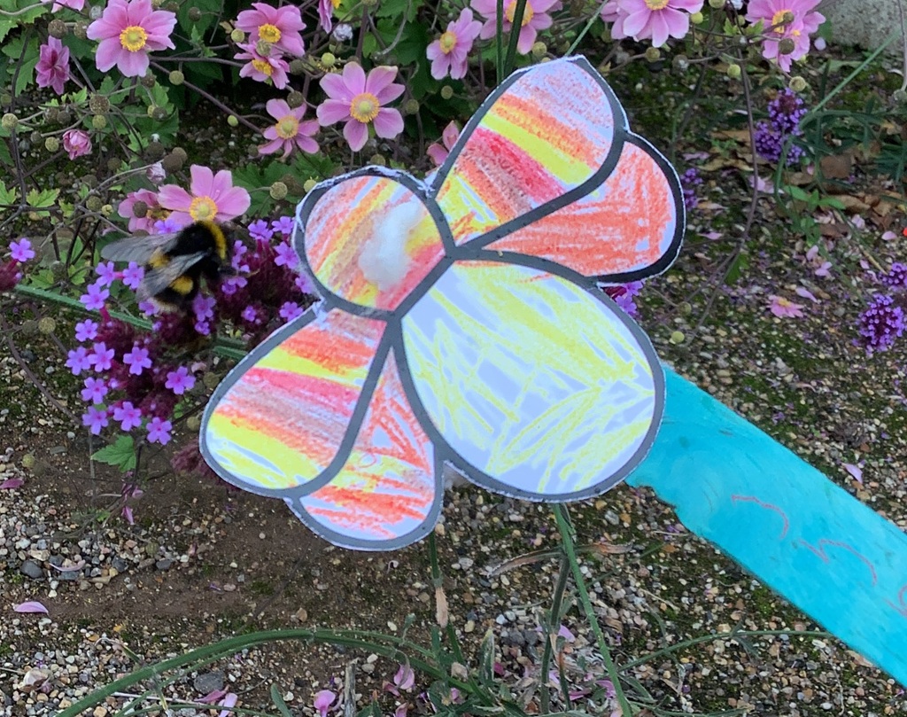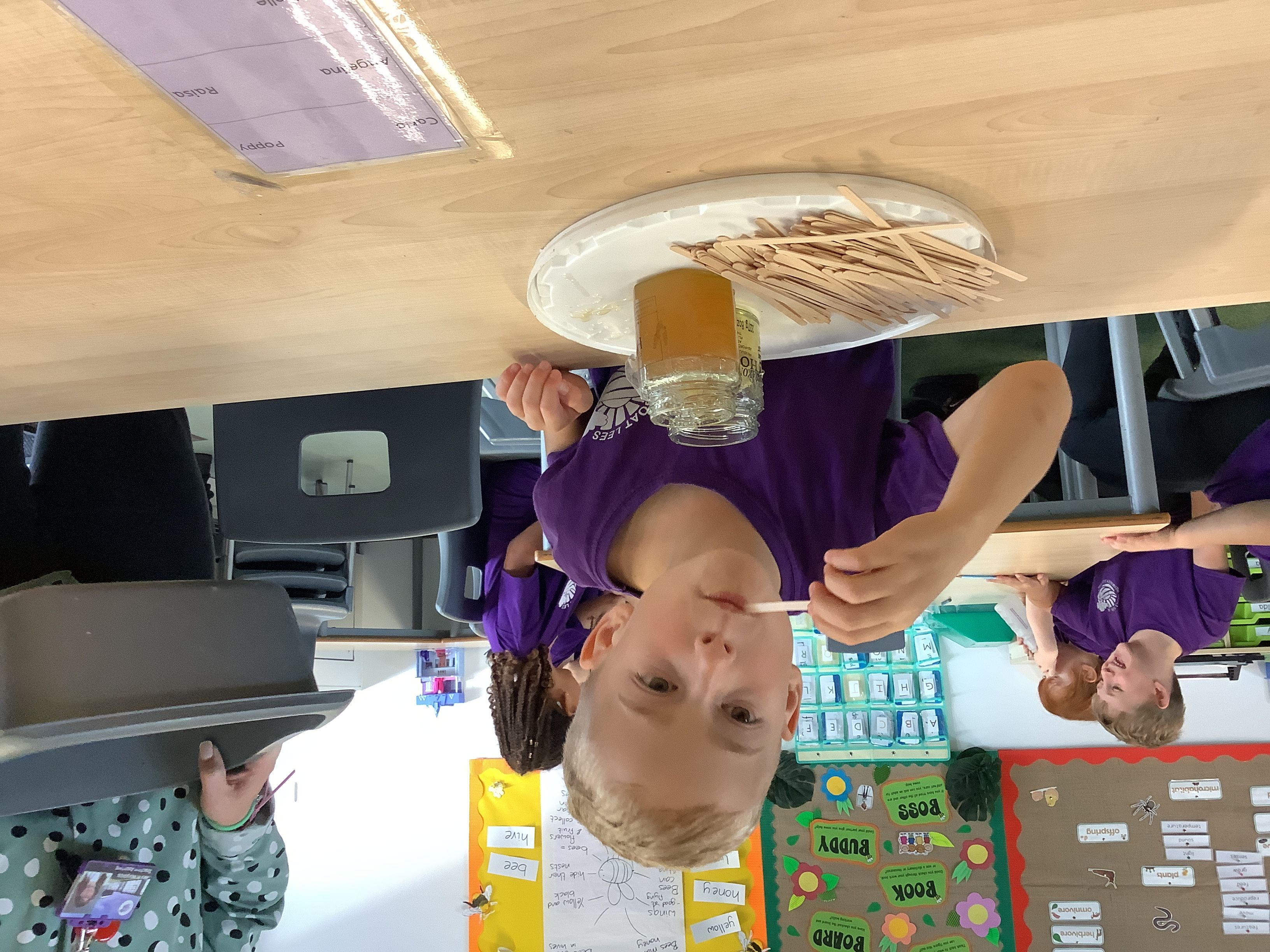 We had a visit into school from a beekeeper who brought in an observation hive of honeybees for us to see. She let us smell the honeycomb, look for the queen, listen to the sound of 3,000 bees moving around inside the hive, and taste two different honeys. She showed us her beekeeper gear and told us loads of facts about honeybees! We also went to Godinton house to look for bees, fortunately they seemed to be well trained so two of them posed nicely behind their identification photo for us! We listened to a story about bees and then created our own fuzzy paper bees to go and pollinate the garden. One of our paper bees even shared a flower with a real bumble bee, who didn't seem to mind at all!